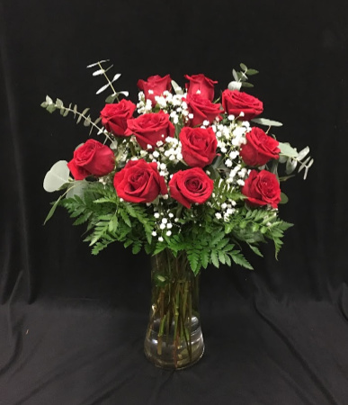 One dozen roses in the color of your choice in a vase with extra fancy and lush greens and baby’s breath
